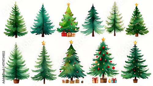 Watercolor Christmas Tree Collection Festive Holiday Design Elements for Christmas Cards and Decorations with Star Toppers and Gift Box Accents
