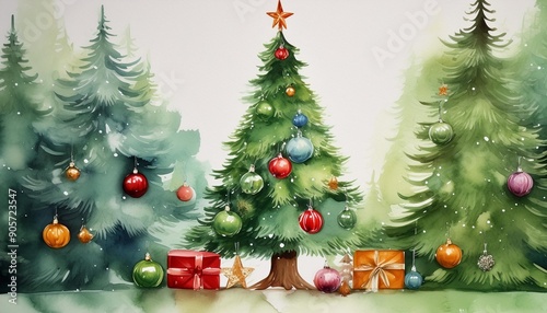 watercolor christmas tree wih decorations on a white background
