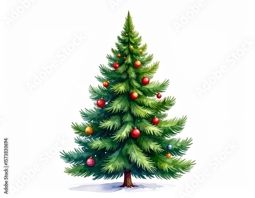 Watercolor Christmas Tree with Red Ornaments – High Quality
