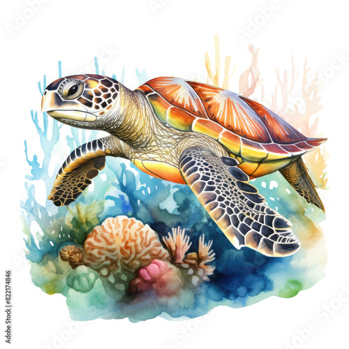 Watercolor Coral Reef Sea Turtle Fish, clipart Illustration, Generative Ai