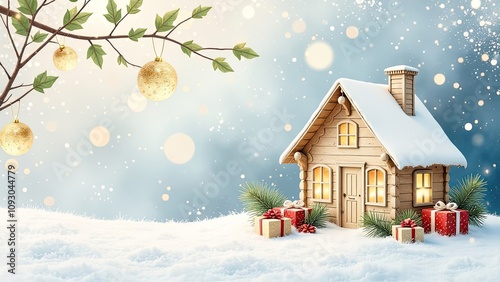 Watercolor cozy house and a gift box under Christmas tree on Christmas winter snow background with golden glitter on greeting cards. Real estate, realtor, mortgage, insurance, booking.