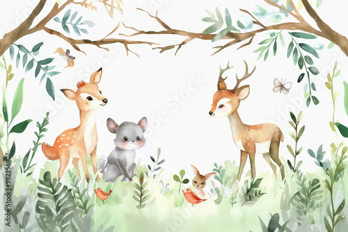 Watercolor cute baby forest animals with space for text, white background, clip art style, white empty space inside frame.