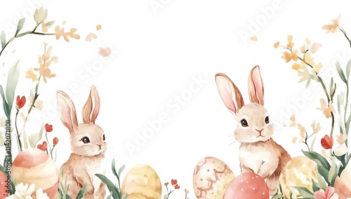 Watercolor Easter bunnies, flowers, and Easter eggs, easter background