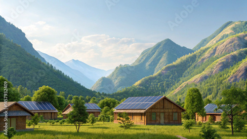 Watercolor Eco-Friendly concept. Scenic mountain village with solar panelled homes amidst lush greenery.