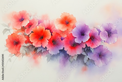 watercolor, floral, arrangement, red, orange, purple, flower, white, paper, background, artistic, botanical, illustration, bloom, blossom, flora, delicate, vibrant, colourful, painting, artwork, design, creative, nature, spring, summer, beauty, elegant, graceful, detailed, soft, light, fresh, romantic, decorative, pattern, texture, canvas, pigment, brush, stroke, hand-made, craft, style, modern, contemporary, drawing, vignetting