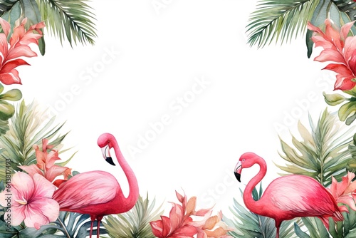 watercolor floral border frame of tropical flowers and leaves and pink flamingos with empty space for text