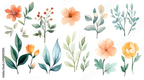 Watercolor floral clipart set, various leaves and flowers, pastel colors, white background, vector illustration style, simple design, high resolution, no shadows, cute, detailed, watercolor texture