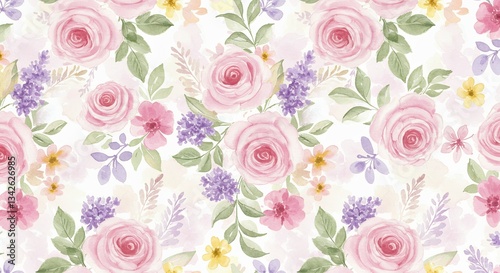 Watercolor Floral Pattern with Roses Lavender and Leaves for Backgrounds