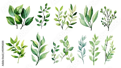 watercolor, floral, set, green, leaf, greenery, branch, twig, etc, cut, hand, drawn, illustration, white, background, watercolor, clip art, drawing, leaf, plant, nature, tree, vector, flower, tree branch, spring, design, decoration, pattern, symbol, foliage, icon, herb, plant, eco, summer, environment, growth, rosemary