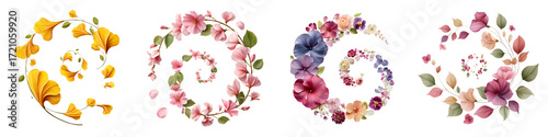 watercolor, floral, spiral, flower, leaf, leaf, botanical, design, element, illustration, art, decorative, chaplet, frame, border, circle, isolated, white background, spring, summer, autumn, nature, elegant, romantic, vintage, retro, pastel, pink, yellow, purple, wedding, invitation, card, graphic, template, artwork, floral pattern