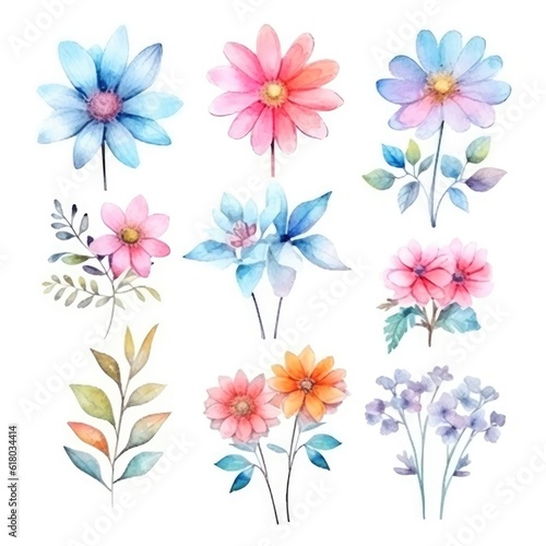 Watercolor flowers. Set Watercolor of multicolored colorful soft flowers. Flowers are isolated on a white background. Flowers pastel colors