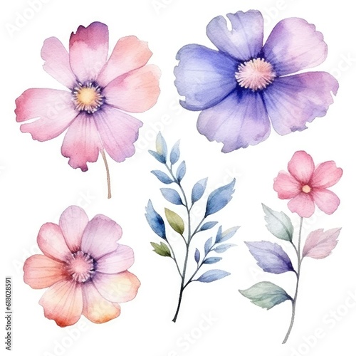 Watercolor flowers. Set Watercolor of multicolored colorful soft flowers. Flowers are isolated on a white background. Flowers pastel colors. generative ai