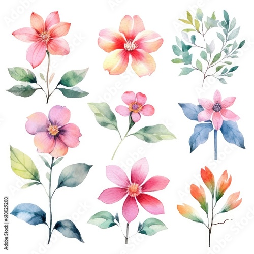 Watercolor flowers. Set Watercolor of multicolored colorful soft flowers. Flowers are isolated on a white background. Flowers pastel colors. generative ai