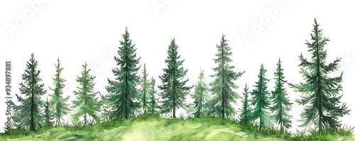 Watercolor forest landscape banner, green trees on a white background. Pine tree silhouettes in a misty forest.