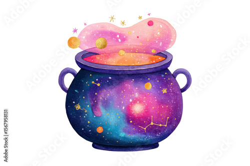 cauldron, galaxy, watercolor, magic, potion, star, pink, purple, steam, cosmic, witchcraft, fantasy, illustration, mystic, mystical, enchanted, boiling, bubble, glistering, gold, sparkle, celestial, nebula, constellations, astrology, alchemy, aethereal, dreamy, whimsical, fantasy art, isolated, clip art, graphic design, digital artwork, halloween, holiday, festival, element, design element, image, picture, artwork