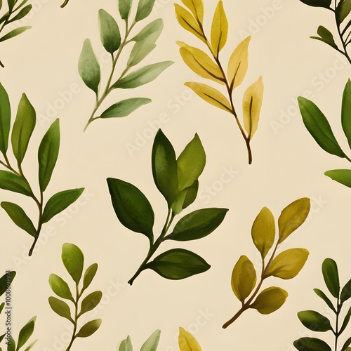 Watercolor Green and Yellow Leaf Branches Seamless Pattern