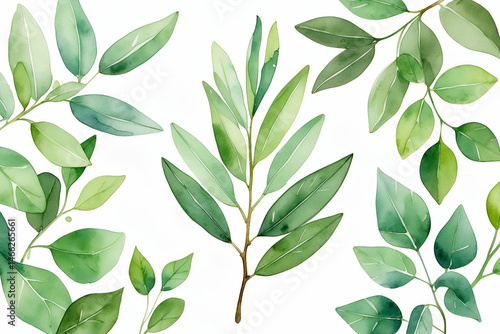 watercolor, leaf, greenery, branch, illustration, botanical, foliage, natural, organic, springtime, summer, light, airy, elegant, painting, background, design element, isolated, white background, fresh, plant, nature, artistic, gentle