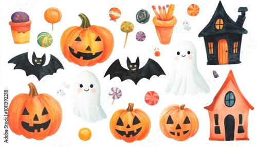 Watercolor Halloween Illustration with Pumpkins, Bats, Ghosts, and Houses