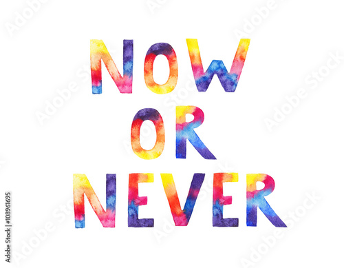 Watercolor hand-drawn cosmic inscription "Now or never" on white background