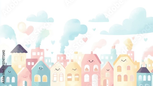 watercolor, illustration, town, house, building, pastel, colours, cartoon, cheerful, happy, smiling, cute, whimsical, cloud, smoke, chimney, heart, sky, window, door, roof, blue, pink, yellow, orange, green, purple, white, art, design, drawing, fantasy, landscape, skyline, residential, neighbourhood, city landscape, architecture, structure, texture, dreamlike, soft, peaceful, calm, gentle, light, serene, simple