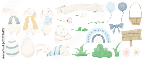 Watercolor Illustration Easter Collection with White Dressed Bunnies, Ribbon Banner, Green Branches with Leaves, Simple Bright Flowers, Scandinavian Rainbow, Basket and Board Sign