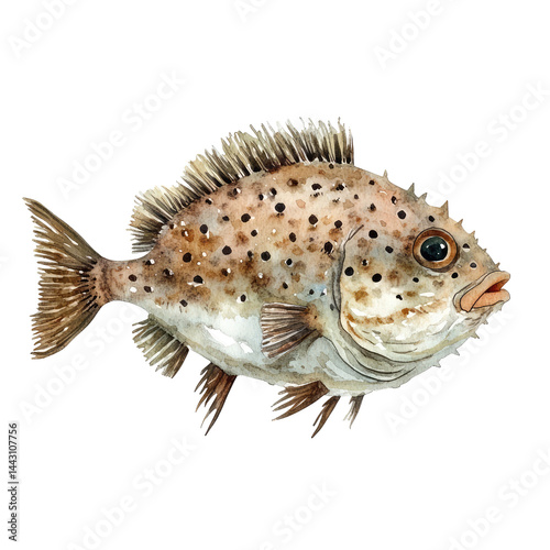 Watercolor Illustration of a Fish with Unique Spotted Texture and Detailed Fin Features for Artistic Use