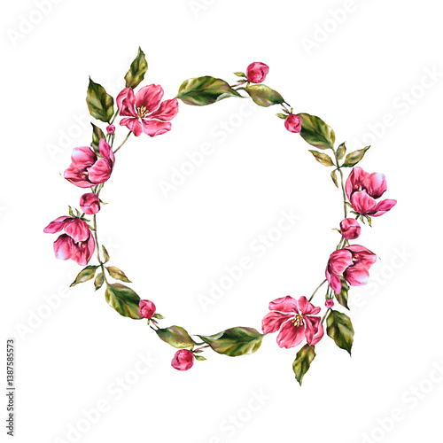 Watercolor illustration of an apple tree branch with blooming pink flowers, green leaves, buds. Hand painted wreath circle botanical set perfect for invitations, cards, spring designs, and packaging