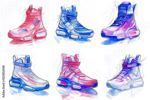 Watercolor illustration of colorful running shoes in various modern styles, representing vibrant footwear fashion and high-performance athletic wear, Generative AI