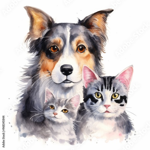 Watercolor Illustration of Dog and Cats with Lifelike Features - Perfect for Pet-Themed Designs and Artwork