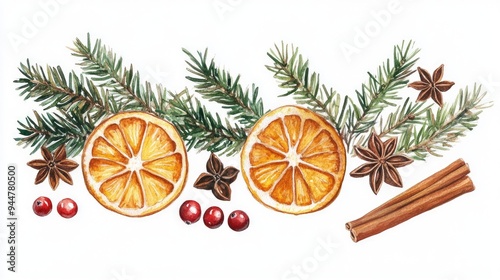 Watercolor illustration of dried orange slices star anise cinnamon stick cranberries and fir branch set against a white background