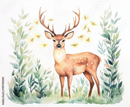 cervid, watercolor, illustration, nature, forest, wildlife, antler, glow, greenery, plant, animal, peaceful, serene, timberland, habitat, fauna, flora, scene, art, environment, life, tranquil, wilderness