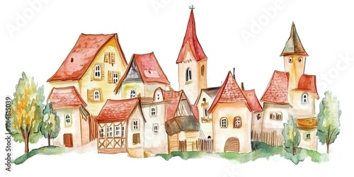 Watercolor illustration of small village in Europe. Alpine landscape on white background