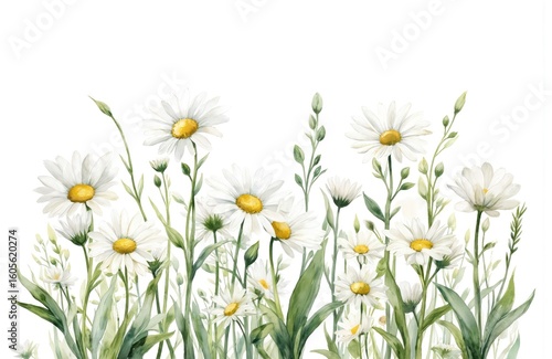 Watercolor illustration of white daisies in a field with green leaves and stems. This floral art features a bright summer bloom, perfect for greeting cards, wedding invitations, or birthday designs.