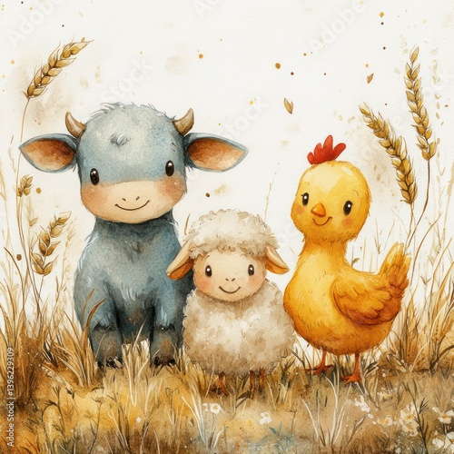 Watercolor Illustrations of Farm Animals Including Bull Sheep Chicken and Chick with Wheat in Whimsical Style
