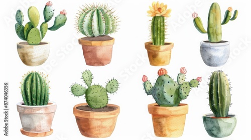 Watercolor illustrations of various potted cacti, showcasing different shapes, sizes, and colors, perfect for home decor and botanical themes.