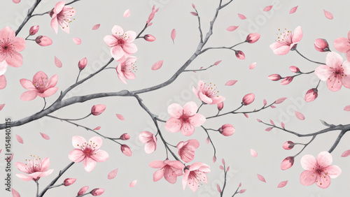 Watercolor Japanese Minimal Seamless Pattern with Sakura Blossoms