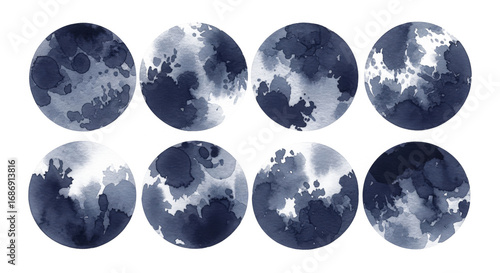 watercolor, moon, phase, lunar, indigo, ink, stage, planet, astronomy, celestial, design, element, round, texture, illustration, circle, space, dark, abstract, hand-drawn, stain, blob, transparent, cut-out, single