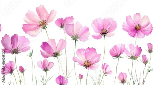 Watercolor of pink cosmos flower isolated on white background,Collection cosmea flower and leaves,wildflowers seamless pattern,soft colorful blooming flower background.