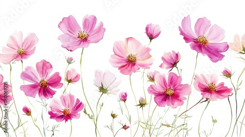 Watercolor of pink cosmos flower isolated on white background,Collection cosmea flower and leaves,wildflowers seamless pattern,soft colorful blooming flower background.