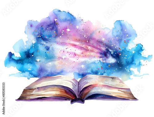 watercolor open book with dreamy cloud and galaxy, clipart white background