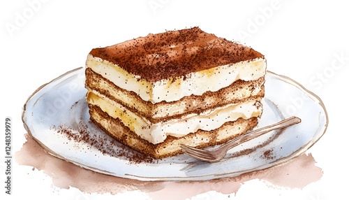 tiramisu, dessert, cake, watercolor, painting, food, italian, cookery, sweet, cocoa, cream, hot drink, ladyfingers, sponge, layer, dish, plate, fork, pastry, illustration, art, artist, delicacy, epicure, delicious, tasty, confection, sugar, treat, baked, white, brown, beige, powder, caffeine, favor, freshness, hand-made, artwork, eatery, cafes, bakery, culinary, serving, slice, square, portion
