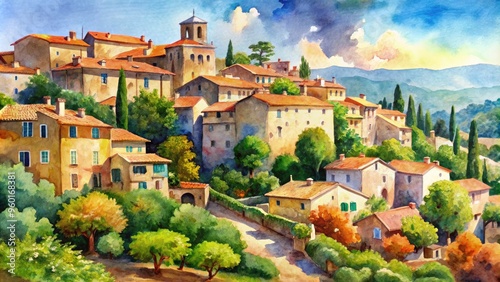 watercolor, painting, art, village, provencal, france, landscape, architecture, traditional, colourful, scenic, countryside, rustic, charming, quaint, picturesque, peaceful, vacation, travel, destination, european, mediterranean, artistic, hand-painted, summer