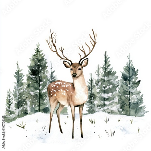 cervid, winter, snow, forest, tree, wildlife, animal, nature, watercolor, painting, art, illustration, christmas, holiday, season, holiday season, winter landscape, peaceful, serene, calm, tranquil, elegant, majestic, antler, pine tree, evergreen, cold, frosty, white, brown, green, snow-covered, winter scene, fauna, mammal, buck, stag, timberland, artistic, creative, beautiful, scenic