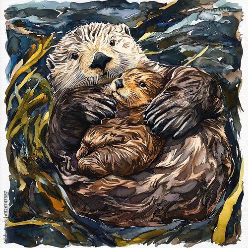 otter, puppy, watercolor, painting, wildlife, animal, mammal, marine mammal, ocean, nature, water, kelp, family, love, affection, cute, adorable, protective, wild, art, artwork, illustration, design