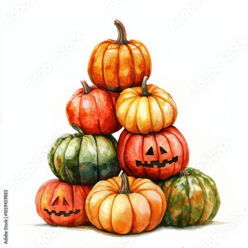 watercolor painting of a stack of pumpkins painted in vibrant Halloween colors, on isolated white background