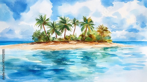 island, beach, ocean, sky, palm, tree, tropical, watercolor, summer, nature, travel, vacation, paradise, landscape, art, painting, blue, green, white, sand, water, horizon, sun, cloud, calmness, calm, beauty, vibrant, serene, lush, foliage, coast, coastline, shore, seacoast, get-away, relaxation, exotic, dream, escape, scenery, sea, coastline