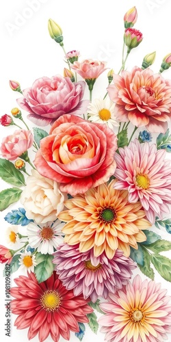 Watercolor painting of a vibrant floral arrangement with roses, dahlias, and daisies on a clean white background, vibrant, roses
