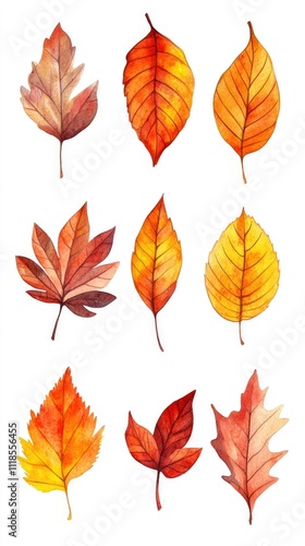 watercolor, painting, autumn, leaf, collection, orange, yellow, red, brown, foliage, fall, nature, season, design, illustration, art, graphic, element, vibrant, colourful, bright, warm, hue, shades, tone, texture, detail, intricate, pattern, beauty, natural, botanical, flora, plant, leaf, deciduous, tree, timberland, forest, crisp, fresh, organic, aesthetic, artistic, image