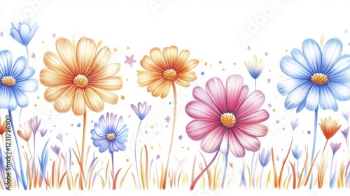 watercolor, painting, daisy, flower, field, orange, pink, blue, green, grass, confetti, bright, cheerful, whimsical, spring, summer, floral, nature, art, illustration, botanical, design, pattern, background, texture, border, seamless, vibrant, colourful, pretty, cute, happy, romantic, delicate, soft, gentle, calm, peaceful, tranquil, fresh, springtime, garden, meadow, wildflower, blossom