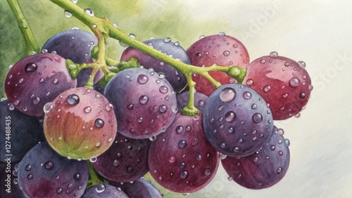watercolor, grape, dew, still life, closeup, purple, red, painting, fruit, composition, hue, vine, leaf, stem, macro, texture, art, image, background, design, nature, fresh, juicy, ripe, sweet, botanical, vibrant, colours, detail, elegant, realistic, vintage, rustic, glistening, dripped, morning, summer, autumn, food, drink, wine, farm, garden, organic, moist, shiny, flocked, tree branch, illustration